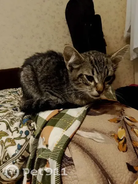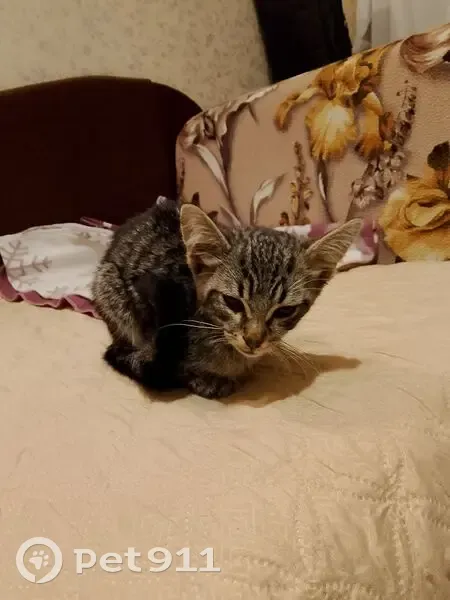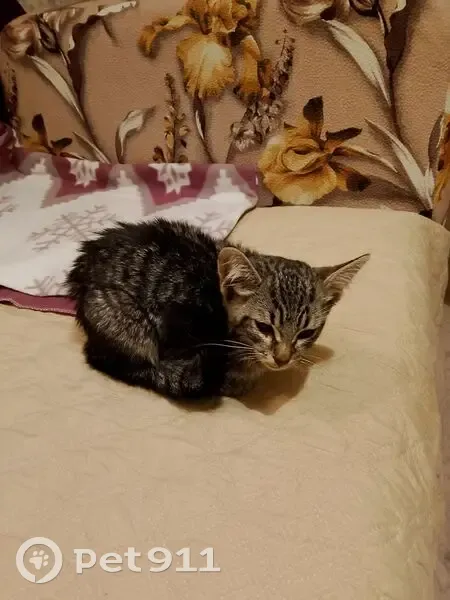 Чёрно-серый окрас, очень тощая. Упала с ветки дерева прямо перед нами, сильно ударилась об асфальт. Надеемся, что травмы головы нет, ветеринар, по крайней мере, не подтвердил.