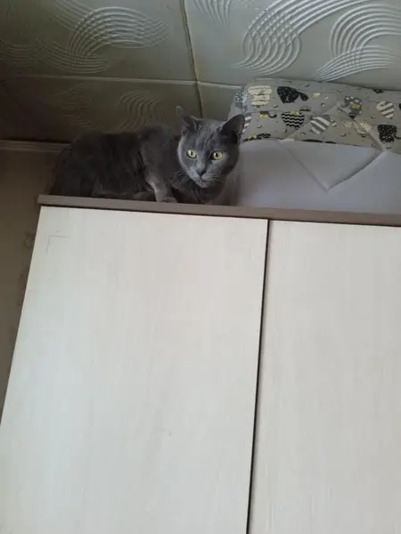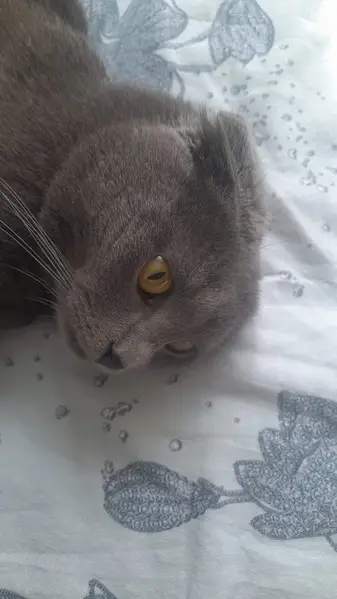 Серая молодая кошка с янтарными глазами( на вид 6-8 мес.) Похожа на британскую породу. Пришла во двор и не уходит. Видно, что домашняя, людей не боится, идет на контакт.