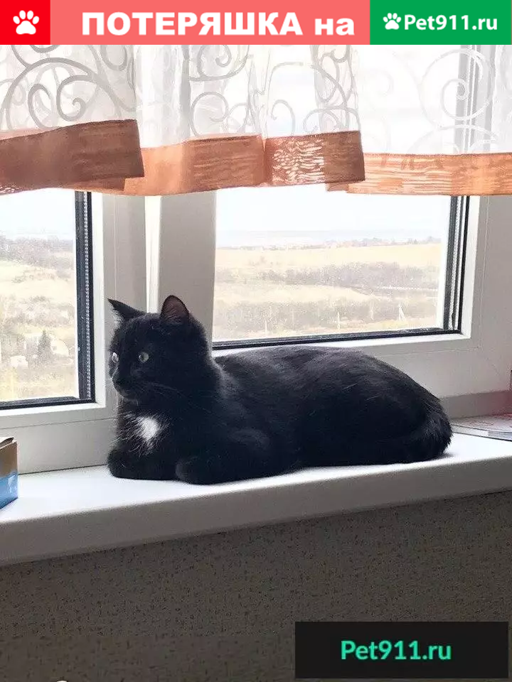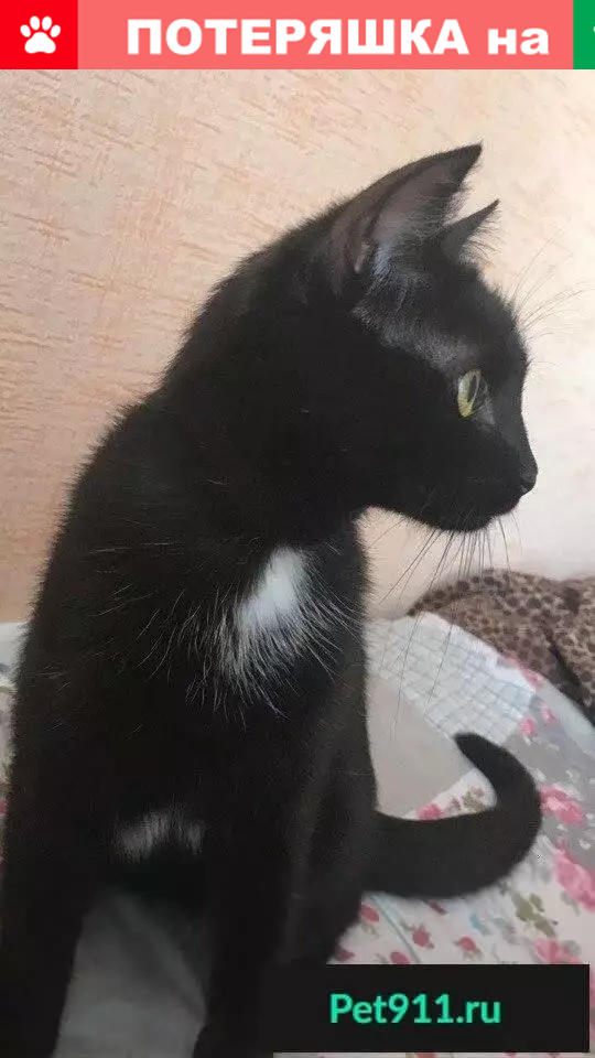 Пропала кошка(выпрыгнула с балкона)ночью.Дериглазова 81.черная с галстучном,на животе и под лапками передними так же белая шерсть