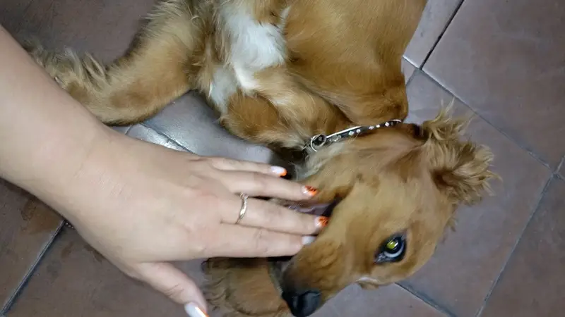 Песочно-рыжая, с черными глазками,как пуговки, аккуратные ушки, небольшого роста, очень доверчивая, ошейник розовый кожаный с выдавлены и сердечками, с права на боку перед задней лапа на шерсти макушка