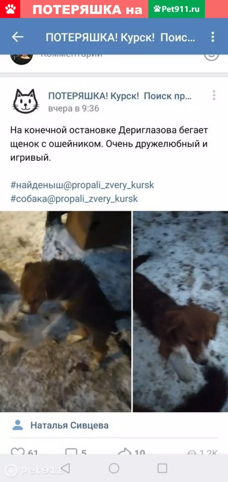 Пожалуйста, помогите найти щенка! Внешний вид — смесь с биглем. Имя — Умка. Возраст 4 месяца. Живет в р-не снт Зеленая Роща (конечная ост. Дериглазова). Нашедшему в знак благодарности — 5 000 рублей. Пропал 5. 12. Первые дни его видели на коечной ост. Дериглазова, потом перемистился к памятнику на Дериглазова. Тел. : +7 919 171 08 80 +7 910 315 38 21 Пожалуйста, возьмите его к себе, мы сразу его заберём! Был оет ошейник, как на фото.