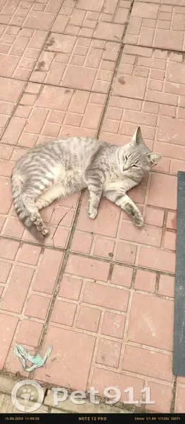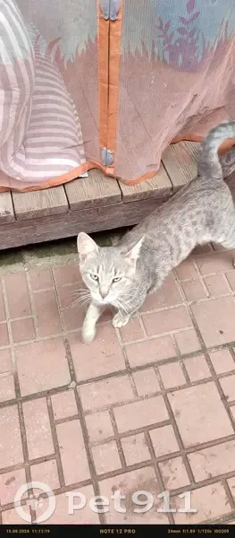 Нашли 15.08.24 около 12 00. В СНТ лесное. Кот мальчик серого окраса. Забежал на наш участок, кот выглядит ухожено, уходить не собирается.