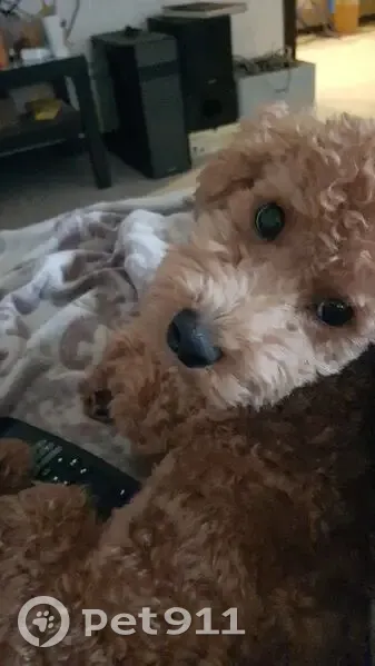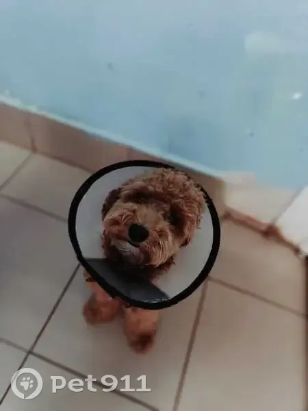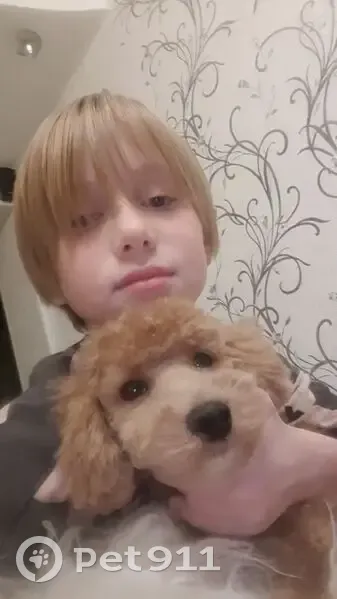 Кудрявый,рыжий, в синей шлейке в ромашку, очень активный, любит по играть, должен отзывался на кличку тедди,тедди Фреди, пугливый но не кусается, и отзывается на кушать маленький сбежал под воротами.