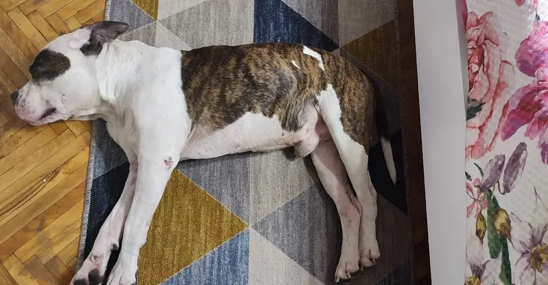 Окрас чёрно-белый, девочка 7 месяцев.была одета в серый костюм и фиолетовую шлейку . Убежала вместе с розовым поводком