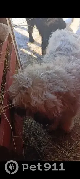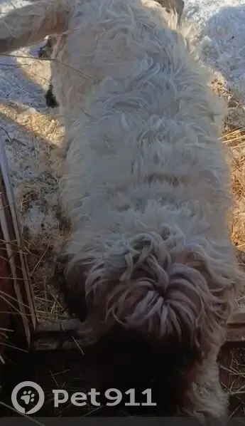 Крупная,взрослая собака. Окрас серый. Собаку только подстригли,лапы и чёлку. Собака добрая,улыбается. Собак не боится. На собаке два ошейника. Внешне их не видно за волосами.
