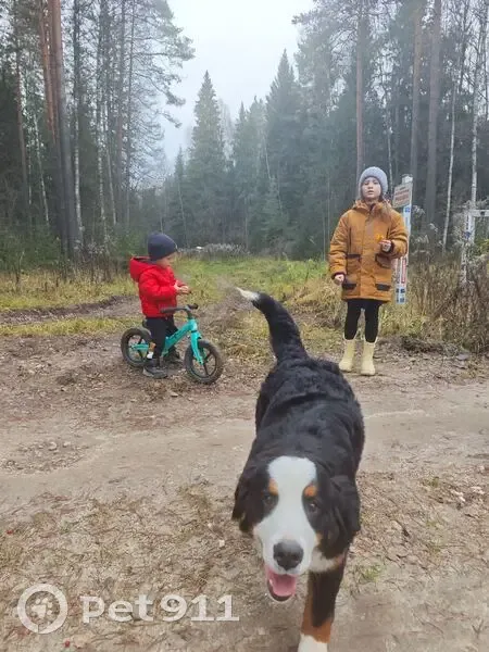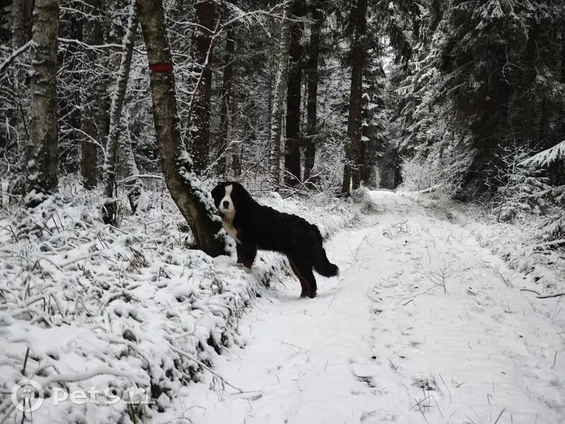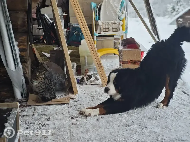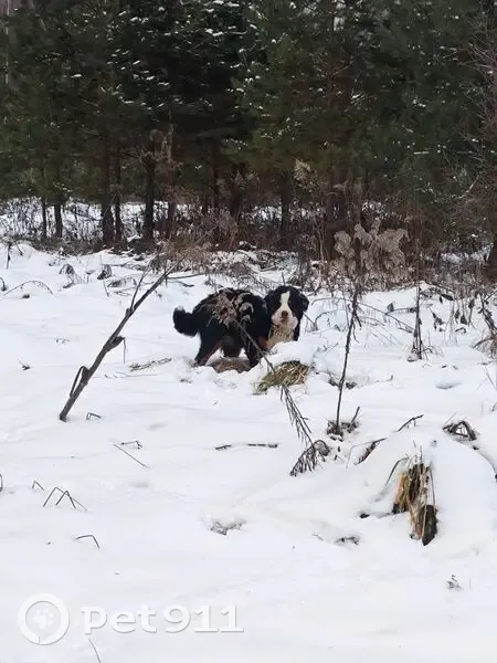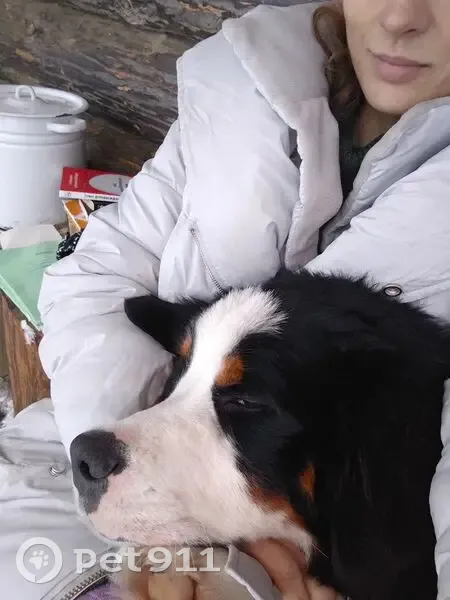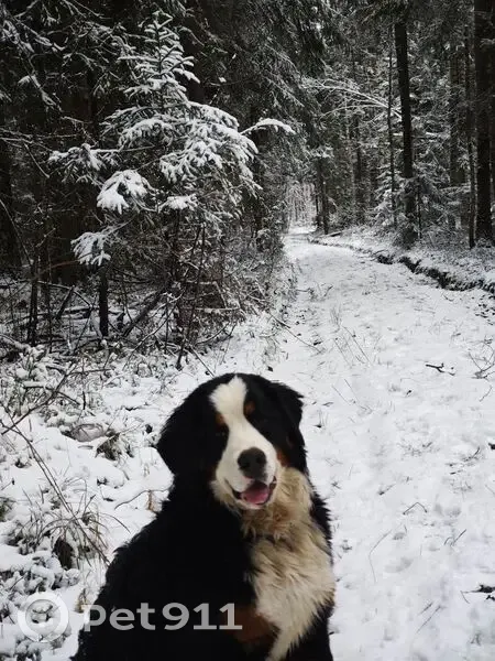 Окрас триколор. Черный основной, белая полоса по морде ло лба и белая пасть. Маленькие вкрапины коричневого на щеках. Белая грудь, по бокам рыжие пятна, лапы трехцветные. Одна лапа белого окраса выше чем вторая. Хвост спина черные, хвост заканчивается белой кисточкой. Пушистая, длинношерстная, уши висят вперед. На шее ошейник тонкая цепь. Над глазами рыжие пятнышки