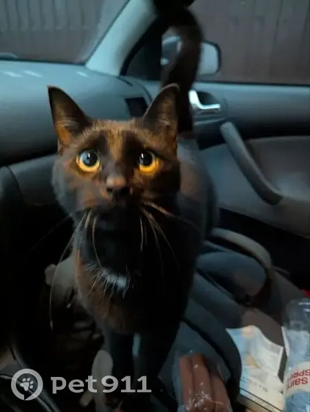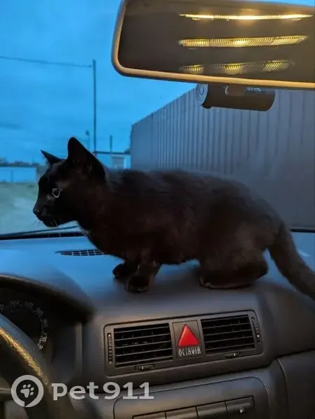 Черный кот, кастрированный. Полностью черный с белым пятном на шее/груди. Чипа нет. Очень ласковый. Был очень голоден, шел за мной пол часа, даже после того как покормил. Поднимал лапы от холода. Сам запрыгнул в машину.
