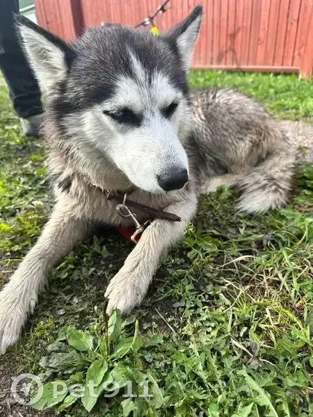 ЛО Приозерский район СНТ Родничок (рядом с пос. Моторное, Ларионовское поселение) Найдена хаски (девочка) с красным кожаным ошейником в сердечко, бегает по садоводству, пока забрали себе соседи