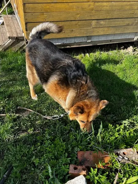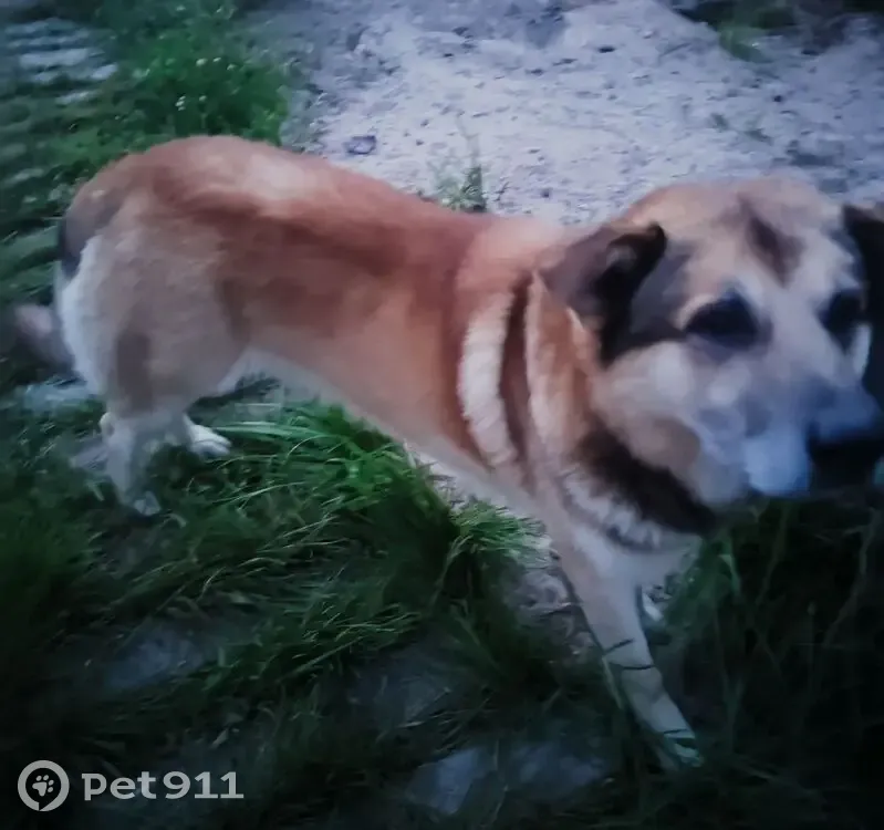 Рыже- жёлтый окрас. На шее есть ошейник фото прикрепляю, но без номера телефона хозяина. Пёс добрый, не агрессивный, нос седой видно, что взрослый уже. Откликается на Рыжий.Прибегает к соседской собаке по ночам, сторожит её у ворот. Стали его подманивать, чтобы накормить. Есть с аппетитом. Скинули фото по соседним поселкам- Сергеево, Цветочное. Никто не знает, чей пёс. Скоро осень и зима, хотелось бы найти родного хозяина, видно, что потеряшка.