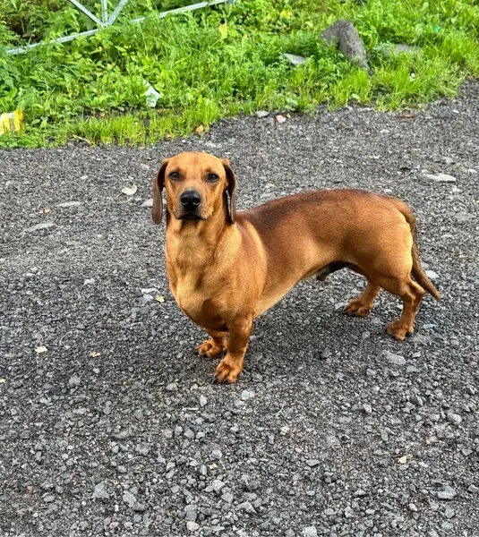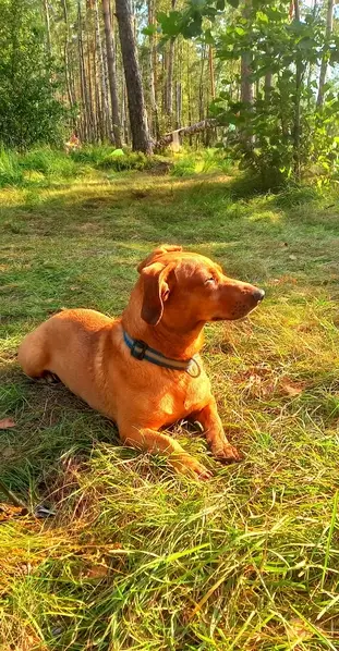 Такса, коричневая,ю, вес порядка 4кг, ошейник - чёрный. На правом ухе изнутри коеймо-татуировка : FCR xxxx. Была в диком лесу рядом поселком Ладожское Озеро, изможденная и еле живая. Умная. Тел. 89219645735.