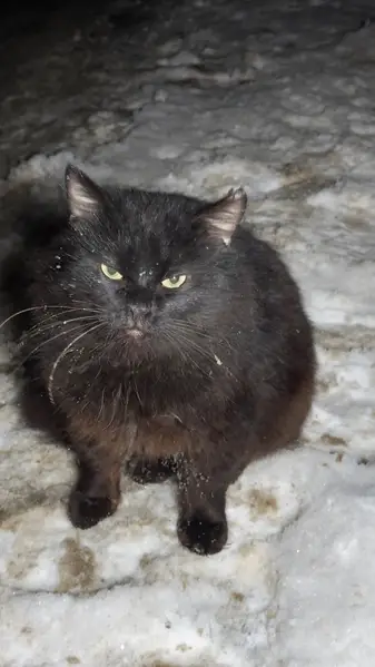 Черный, без пятен. Жёлтый ошейник(возможно из-за длинногерсти не виден), ласковый.Кот не молодой. Откликается на Джоник