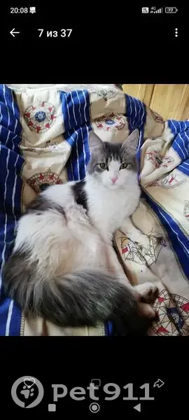 Кошка большая, пушистая,белая с серыми пятнами на спине, хвост серый, пушистый. Убежала с участка, испугалась грозы. Осторожная, может на руки не пойти