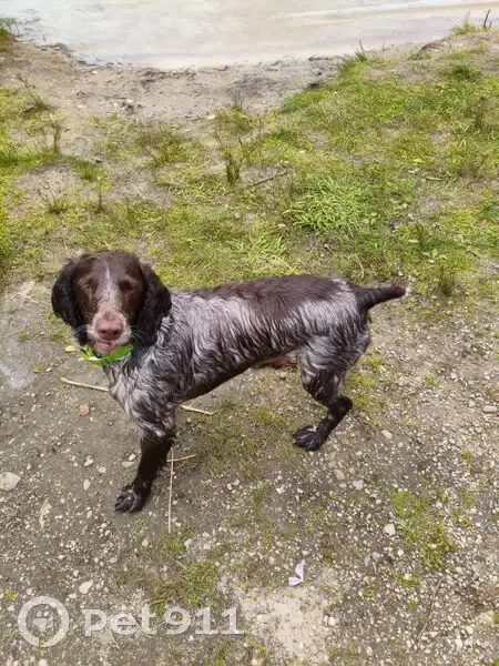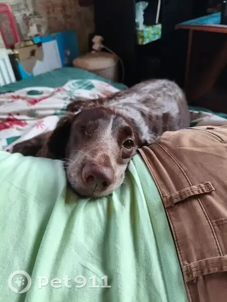 Русский спаниель, коричнево-серый окрас. Собачка БЕЗ одного глазика. Зелёный ошейник. Поймал большой стресс, после испугался и убежал. Несколько часов бегал по деревне и резко пропал.