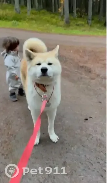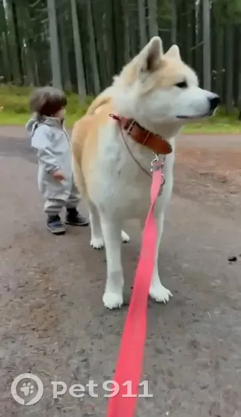 Собака Акита, отзывается на кличку Бэй. Дружелюбный пес, любит людей. Всегда готов полакомиться вкусняшками. Сидел на террасе на поводке, выключили свет в поселке, испугался( довольно пугливый пес). На шее висит медаль на красной нитке с номерами телефонов.