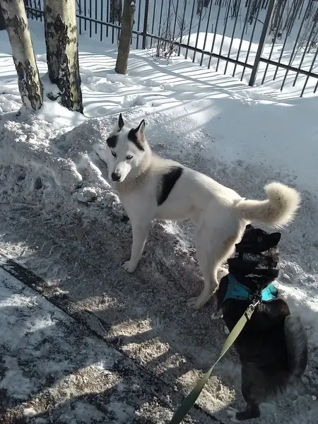 Пропала собака,метис,крупная, белая с серыми пятнами,хвост колечком,была в ошейнике,к людям и другим собакам недоверчива