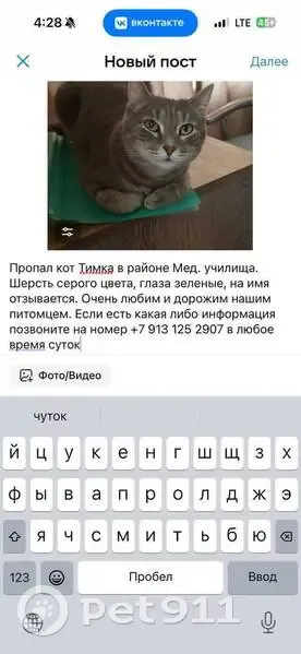 Пропал кот Тимка в районе Мед. Училища. Шерсть серого цвета, глаза зеленые, на имя отзывается. Очень любим и дорожим нашим питомцем. Если есть какая либо информация позвоните на номер +7 913 125 2907 в любое время суток