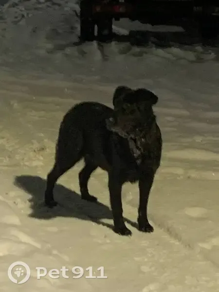 Собака подошла сама , когда мы выгуливали своих собак. Совсем без агрессии, но погладить и взять за ошейник не даёт, отбегает. Крупная, черная, ошейник красный. На участок не заходит, сидит в палисаднике.