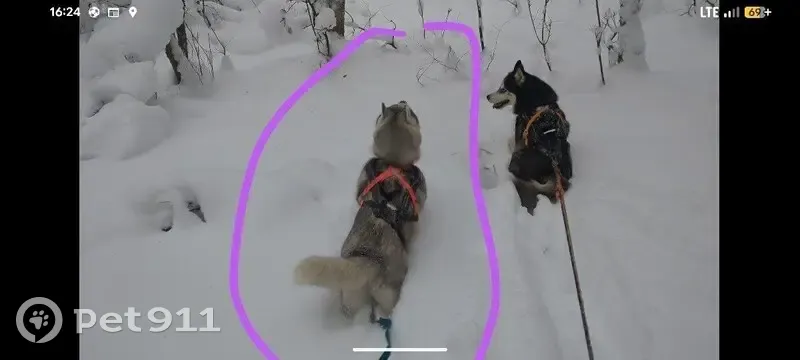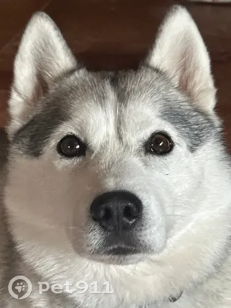 Хаски, Серый окрас, карие глаза, 5 лет. Была в серо-розовой шлейке и синем подтяге, как на фото.