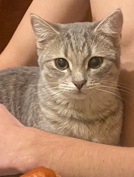 Молодой котик, окрас серый в полосочку, грудка светлее, на груди полосочки как ожерелье, слегка приплюснутая мордочка, небольшой хвост. Стал приходить на дачу (СНП Спутник). Подкармливали, искали хозяев. Когда наступили холода, котик стал жить на чердаке дачи. Очень ласковый, громко мурлычет. Спокойный, но любит и поиграть. Но пока пугливый, боится шума. Явно домашний, ест все, что дают, ест очень аккуратно. Оставили бы себе, но своя кошка категорически его не признает, гоняет, домой не пускает! Надеемся, что или найдется хозяин, или кто-то захочет себе взять.