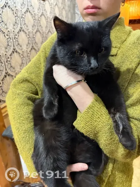 Черный короткошерстный кот с жёлтыми глазами. Чистый, упитанный, ласковый. Прибежал, когда открывали дверь в квартиру, забежал внутрь.