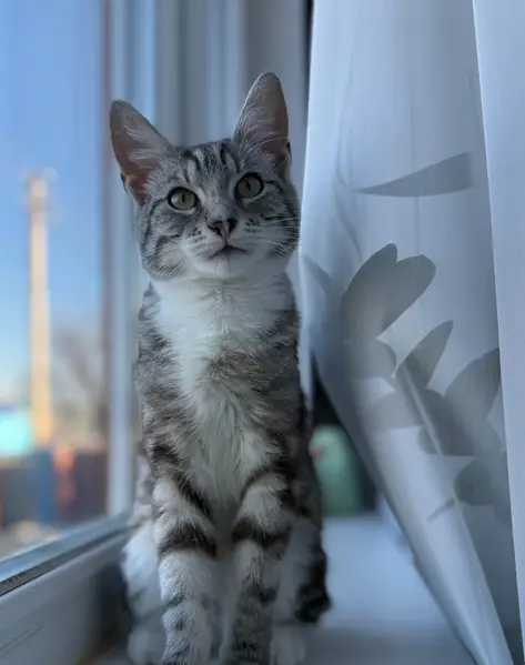 Молодая, небольшая по размеру кошечка, очень ласковая, бежит к людям, лезет на руки, встаёт на задние лапы и топчется по ноге. Чистая мягкая шерсть (короткошёрстная, в полоску), не пахнет, подушечки мягкие. Возможно случайно убежала или выпала из окна.