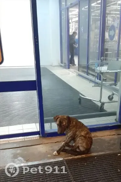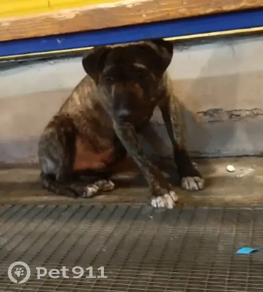 Найдена собака (щенок), г. Липецк, у магазина Лента по адресу Неделина, 4. Или подброшен или потерян. Похож на амстаффа, кобель, примерно 4х месяцев. Тычется ко всем входящим и выходящим из магазина, видно, что растерян и ищет хозяина. Мыкается по парковке.