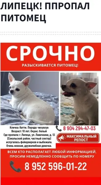 Найден пес, порода чихуахуа, бело-рыжей окраски, мальчик. Найден он 28.05.19 на территории Липецкой Областной Клинической Инфекционной Больницы (ул. Космонавтов). Пес худой, голодный, без ошейника.