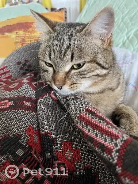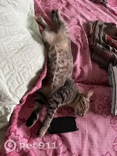 Жестовато-зеленые глаза, серо-коричневый кот. Возраст 1,5 года, не кастрирован. Вокруг глаз характерная темная обводка, лапы с нижних сторон также темные