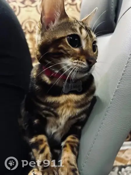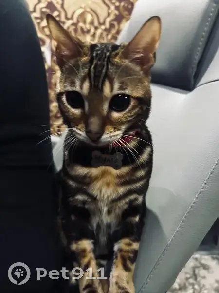 Бенгальская кошка, 8 месяцев. Окрас темный , розетки раскрылись плохо. Кошка домашняя к улице не приучена , вышла на порог и собаки спугнули. Имеется красно-розовый ошейник и адресник на нем.