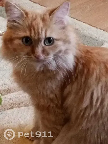 Окрас рыжий с белым,на лбу белой обводкой написана буква M, очень пушистая с красивыми глазами, Пушистика отнесли к дому по адресу который отмечен. Потом он пропал.