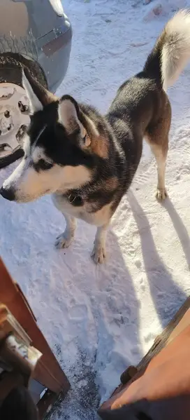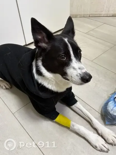 Черно белая собака среднего роста Боится громких звуков не агрессивная Любит вкусняшки
