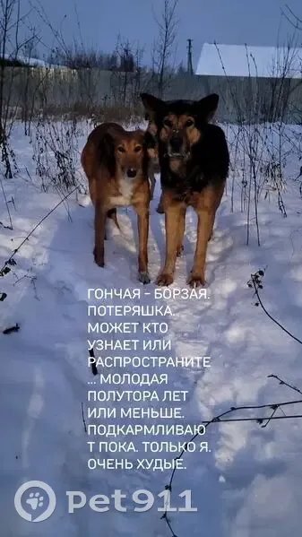 Охотничья гончая- Борзая. (девочка). Совсем молодая пугливая голодная. Окрас рыжий красивая. Бегает возле пятёрочки в селе Воскресеновка и около заправки село Введенка через дорогу от пятёрочки. Бегает в компании (двух друзей породы дворняги). Может кто потерял или она при охоте убежала. Так часто бывает с Гончими - борзыми. Когда гонят зайца.