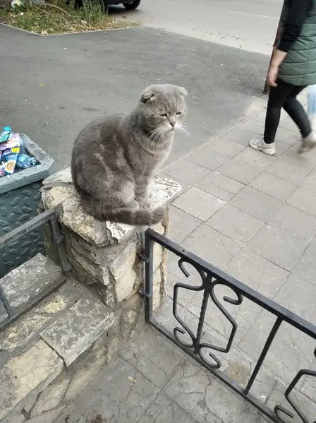 Потерялся домашний кот, возраст 10 лет, шотландский вислоухий, серого цвета, кастрирован, людей не боится, на шее ошейник от блох желто-зеленого цвета.