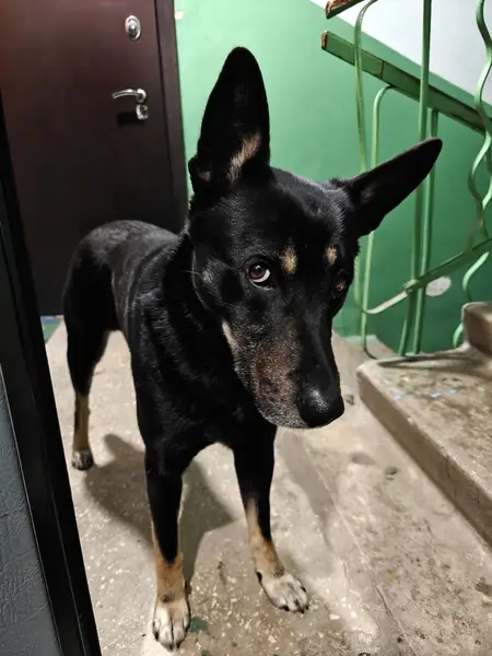 Черная, лапы коричневые, на ней красный ошейник с адресником