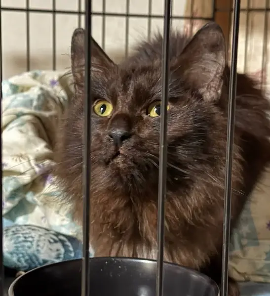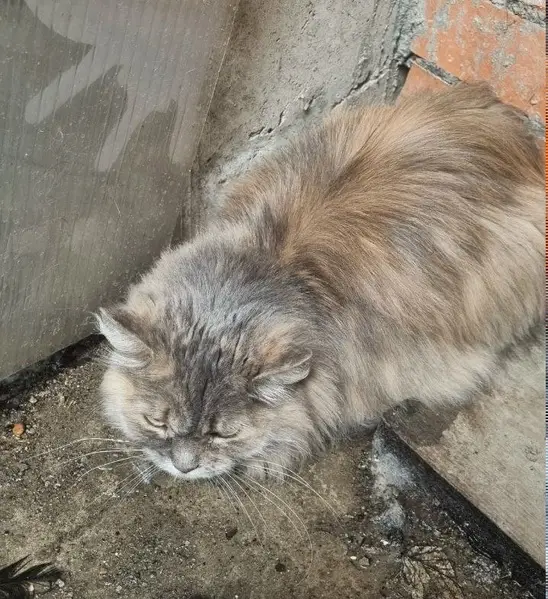 Черный, местами с побурением Пушистый Кастрирован, вес около 4.5 кг, не агрессивный, к людям может относится с опаской Синий ошейник Правое ухо срослось немного неровно Заживающие царапины на переносице Склонен к побегам, убежал с двора частного дома