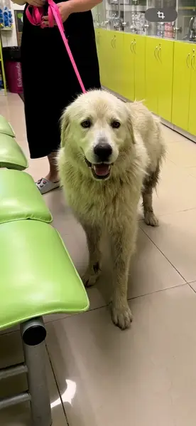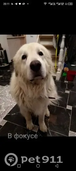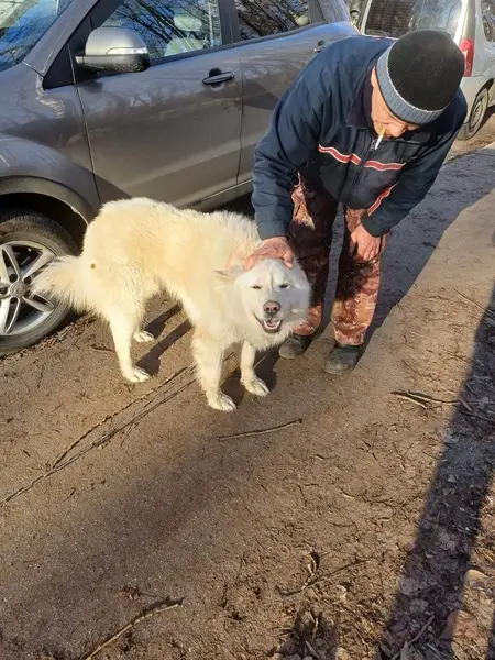 Белый пёс, после линьки не очень мохнатый, с ошейником, на теле есть очень светлые кремовые пятна, нос сейчас почти розовый. Он ушёл с участка через открытую калитку при разгрузке машины