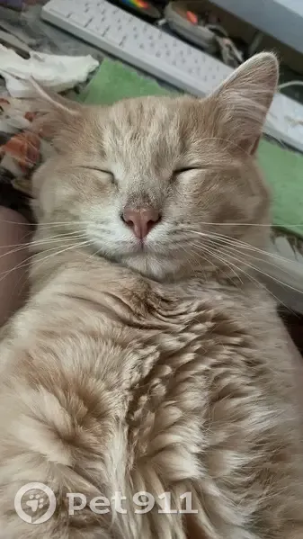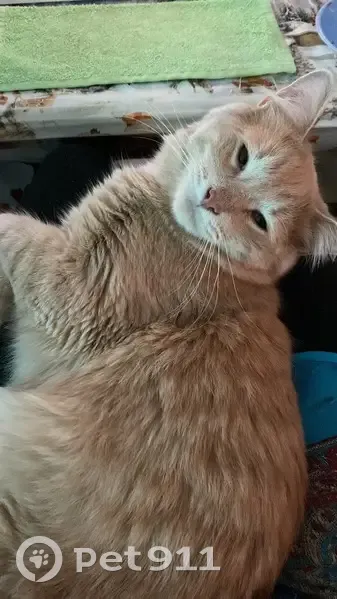 9 месяцев, кастрирован. Окрас светло-рыжий, карие глаза. Треугольная мордочка, пушистый хвост, имеет сходство с мейн куном. Выбежал на улицу и испугался собаки, залез на трубу на участке и не давался в руки. После дождя пропал с трубы и до сих пор не вернулся.