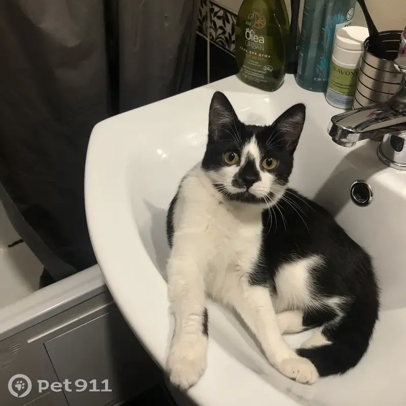 Бусе 1 годик, она черно белого окраса туловище черное, животик белый, хвост черный, глаза желтые. Она короткошерстая. У нее черное пятнышко на носу и лысые бровки, а так же черные подушечки на лапках.