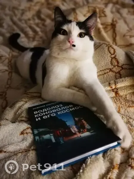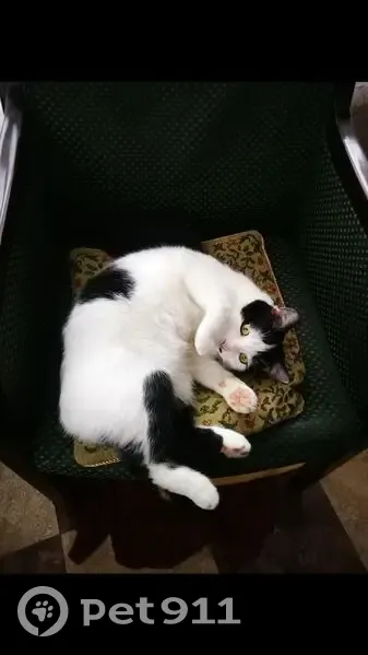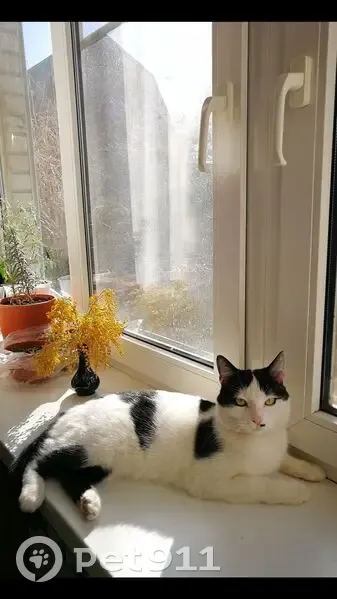 Белый кот с черными пятнами, черный хвост. Есть мушка на щеке. Котик домашний, гулял только в закрытом дворе, как то выбрался на улицу ночью и не вернулся домой. По характеру очень осторожный и пугливый.