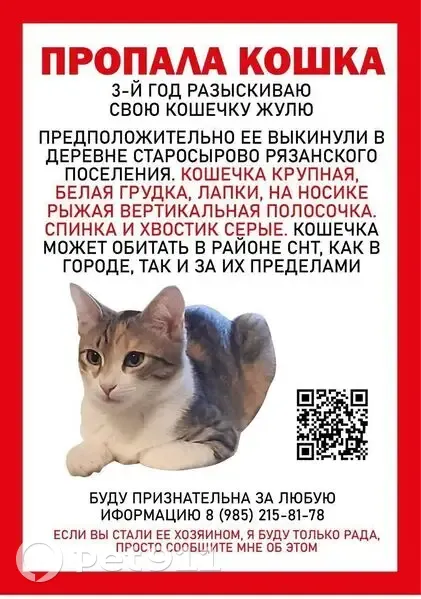 Тинао, Остафьево, деревня Старосырово Рязановского поселения, близлежащие СНТ, Подольск Февраль 2021 Кошечка. Сейчас ей 3 года. Белые грудка, лапки, окрас спинки и хвостика серый и рыжий. Холка белая. Особая примета: рыжая вертикальная полоска на носике и серые разводы под глазами. ️ 89852158178 Алина