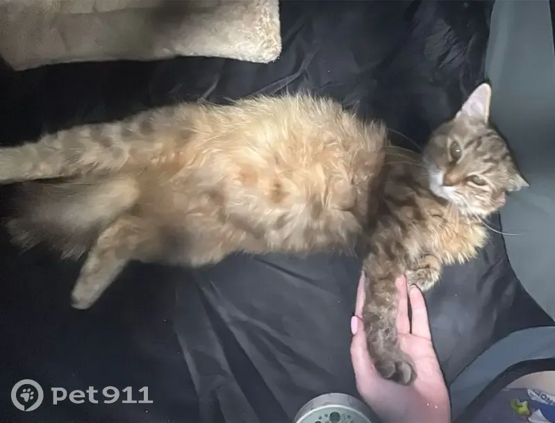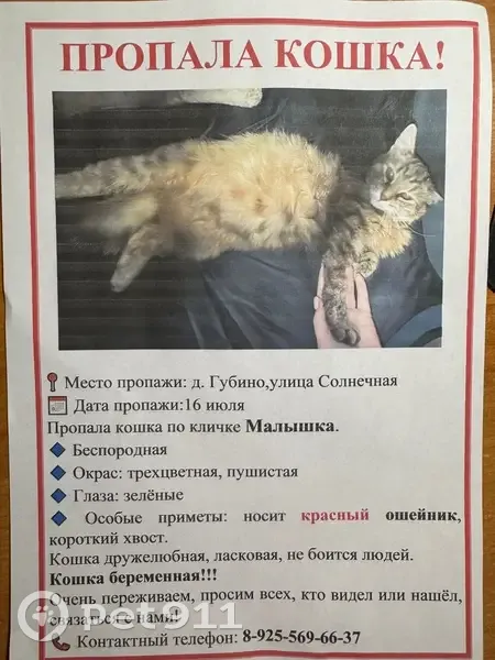 беспородная, трехцветная, пушистая Глаза: зелёные Особые приметы: носит красный ошейник, короткий хвост. Кошка дружелюбная, ласковая,не боится людей. Кошка беременная.