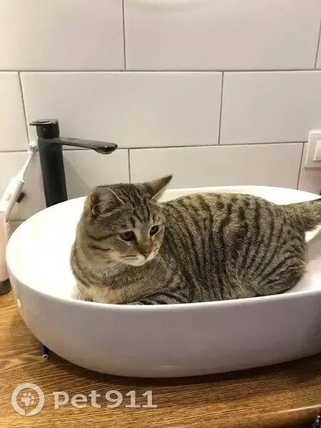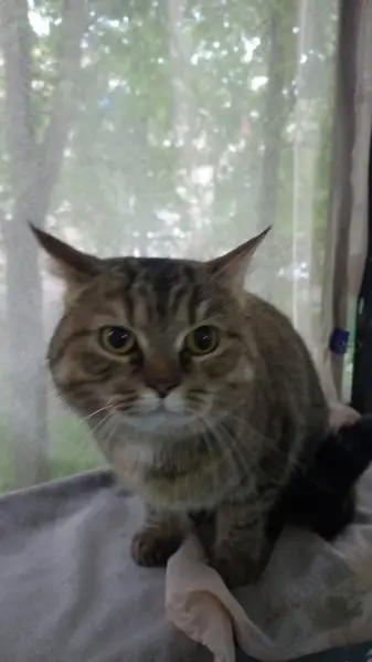 2 годовалый кот , кастрированный , достаточно крупный , игривый ( любит кусать руки ) , мурчит , мерзнет часто ( смешали 4 породы - сфинкс , мейкун , сиам и британец ) , но шерсть очень плотная , четкие полоски по бокам , морда широкая , не особо разговорчивый .