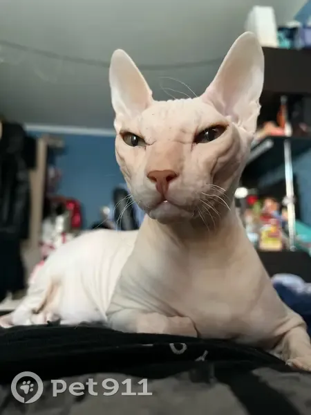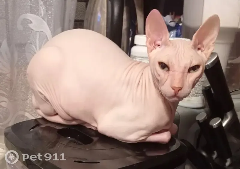 Голокожий сфинкс светло-розового цвета. Под правым глазом шишка. Как пропала не заметили, либо прыгнула с балкона, либо выскочила в дверь, когда ребенок уходил на улицу.
