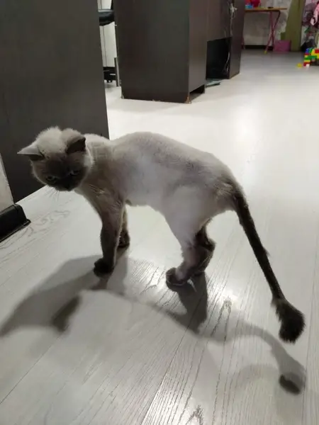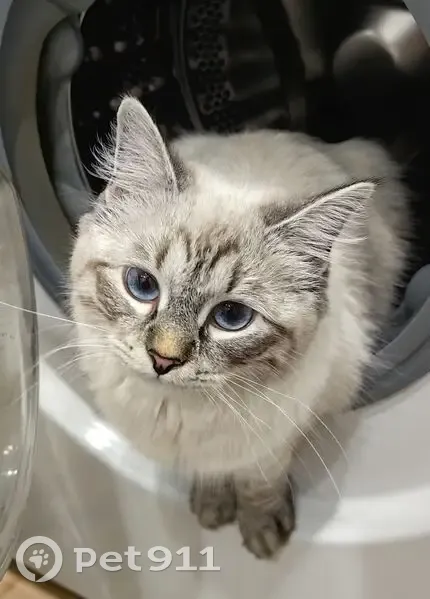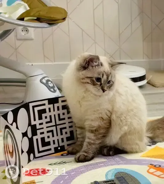 Порода Невская маскарадная, светло-бежевый окрас, темные ушки и лапки, голубые глаза. Кошечка повисла на оконной сетке и выпала вместе с ней со второго этажа.