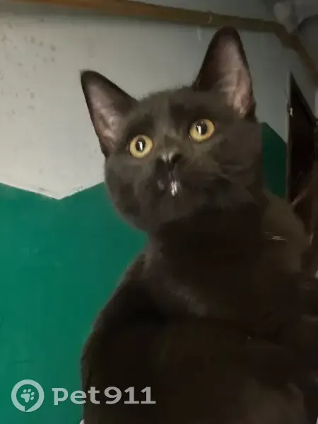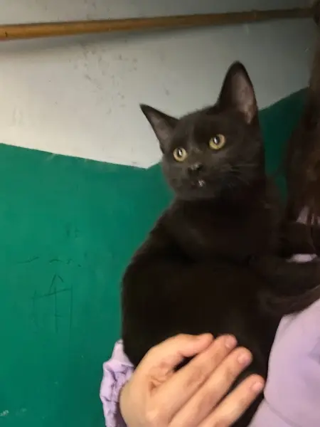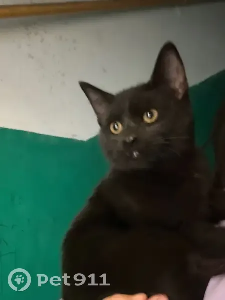 Черный котенок, примерно 6 месяцев Отличительные признаки: под передними лапками белые пятнышки и на животе белое пятнышко, в остальном полностью черный