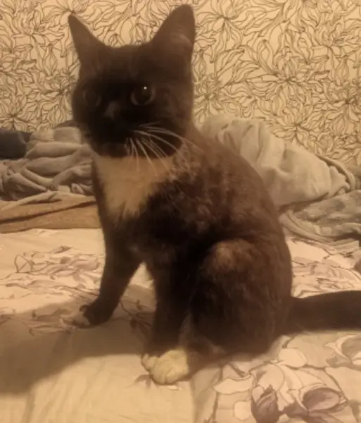 Домашняя черная кошка , грудь и лапки белые , вислоухая. Откликается на кличку Боня. Кошка взрослая , но маленькая. Выбежала из машины на парковке у дома Трашутина 22.