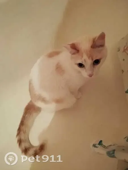 Мальчик, белый окрас с рыжими пятнами и полосатым хвостом. Выбежал в подъезд и на улицу.