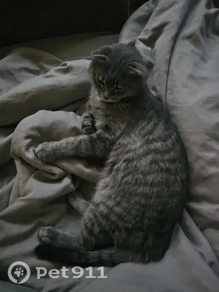 Светло-серенькая, на спинке есть вдоль позвоночника полоска тёмно-серая, от которой идут полоски перпендикулярно позвоночнику тёмно-серые. На груди белый ромбик, пузико светлое ближе к белому, вислоухая, девочка очень ласковая, но людей боится. Если долго звать, возможно подойдёт. Она выпрыгнула ночью из окна 1 этажа, Строителей 15, г. Лесной, Свердловской области