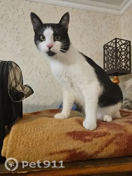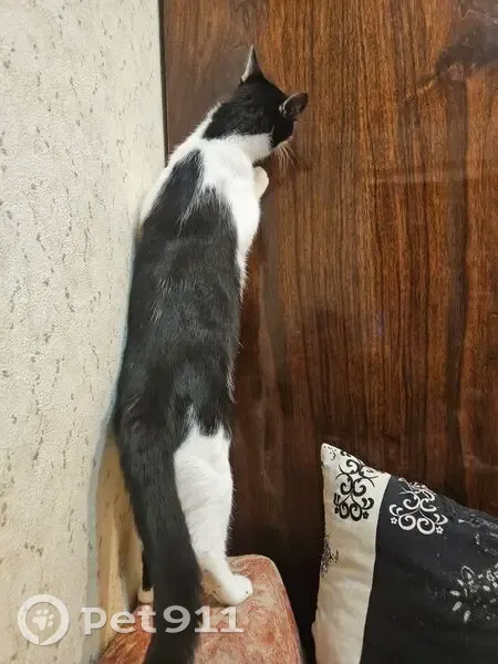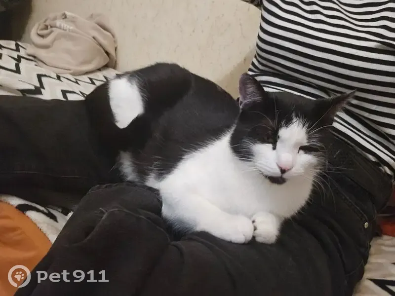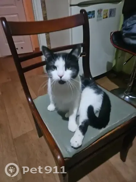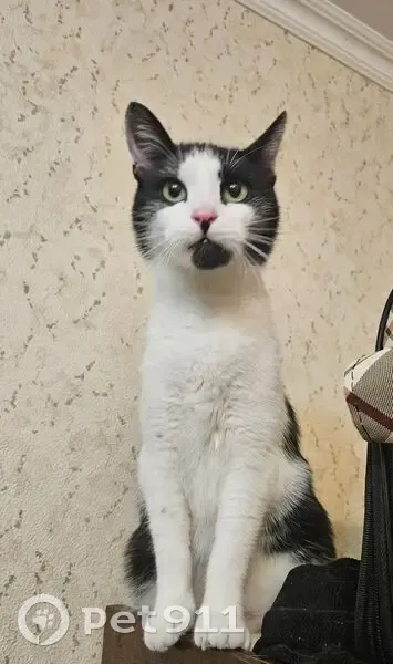 Черно - белая, зелёные глаза. Взгляд немного испуганный, упитанная