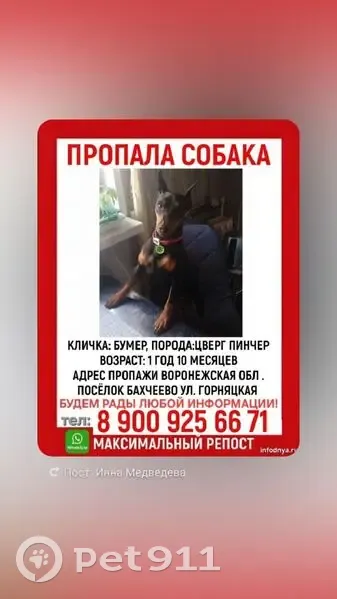 Объединено с объявлением rl1020178. Причина-дублирование информации. Описание дублирующего объявления: Цвергпинчер был украден в поселке Бахчеево, Семилукском районе. Был в красном ошейнике с зелёными адресником